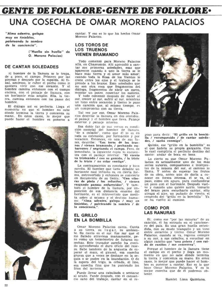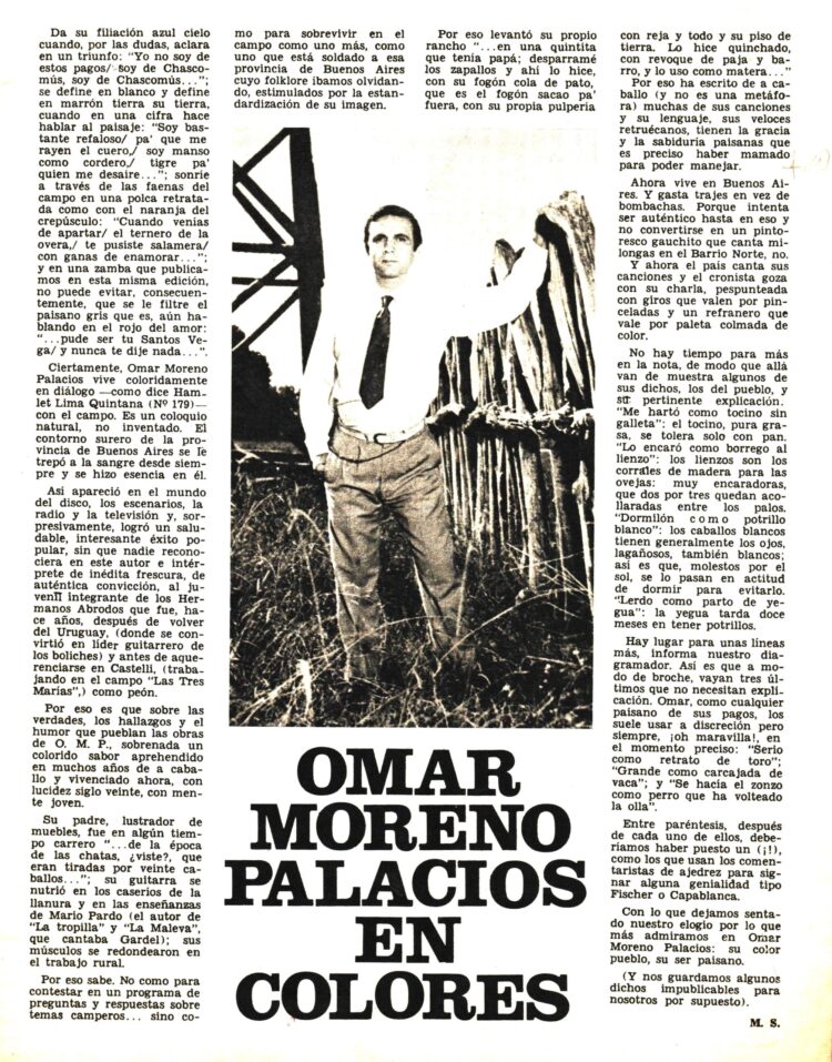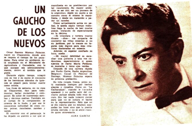 La primera nota sobre el cantor sureño aparecida en el Nº 142 (14/3/1967) estaba firmada por la tucumana Alma García pero curiosamente se acompañaba de una foto que para nada correspondía a Omar Moreno Palacios. En fín… un error del maquetador posiblemente.