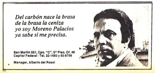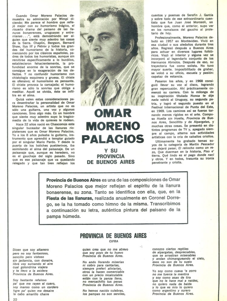 Y en Revista Nº 250 (Octubre de 1975) la periodista Marta Güerci resume de una entrevista, las opiniones vertidas por Omar Moreno Palacios sobre el hombre bonaerense y otros temas. Su imagen apareció en la tapa de ese número.