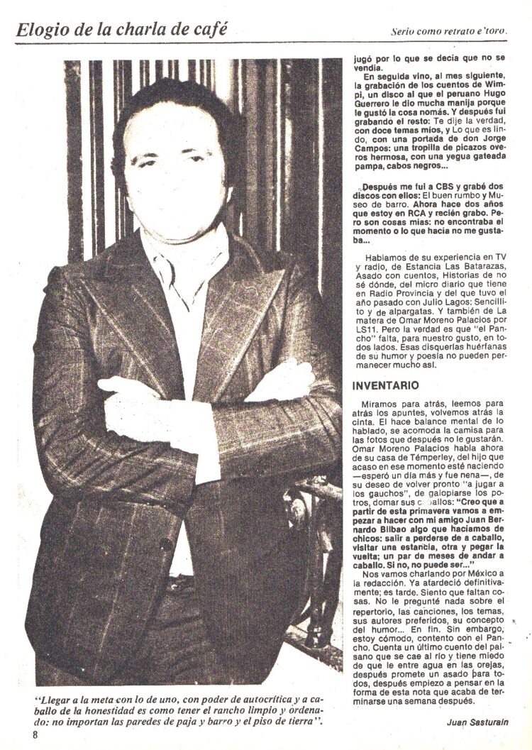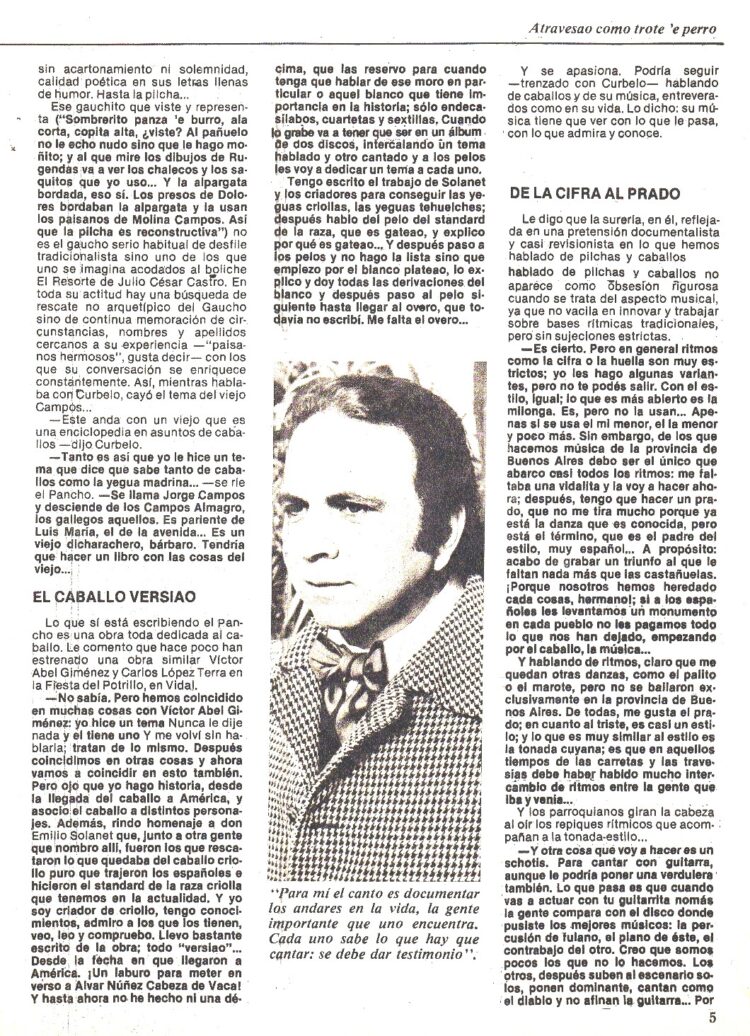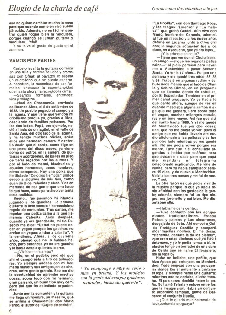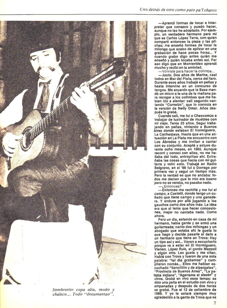Es Juan Sasturain quien publica un extenso reportaje sobre el cantor de Chascomús en el Nº 294 (Junio de 1979). Aparece su imagen en la tapa y en páginas interiores la entrevista transcurre por muchos temas: Habla largamente entre otras cosas de su infancia y adolescencia en los campos bonaerenses. De su comienzo artístico cantando en el Uruguay a los 17 años , donde vivió durante tres antes de regresar para hacer el servicio militar, de sus discos para Trova y CBS , aprestándose a grabar para RCVictor uno sobre el caballo y los pelajes.