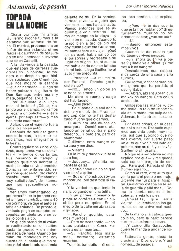 Y para terminar esta recopilación en el Nº 300 (Enero de 1980) Omar Moreno Palacios escribe unas páginas con un cuento de Pancho Laguna al estilo de Wimpi y una anécdota que titula “Topada en la noche”.