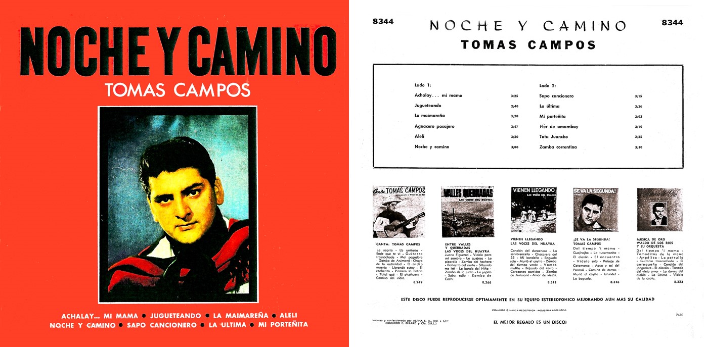 Sin embargo , Waldo de los Rios , le había dado la posibilidad ya en 1955 de participar en una grabación que el  músico y arreglador realizó con su madre Martha de los Ríos y que  tituló “La última palabra” Columbia 8192, Un jovencísimo Tomás Campos canta dos temas: “Vidala de la copla” y “Zamba de las tolderías“; Se dejan esos registros sonoros.