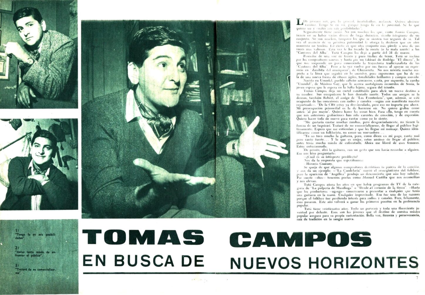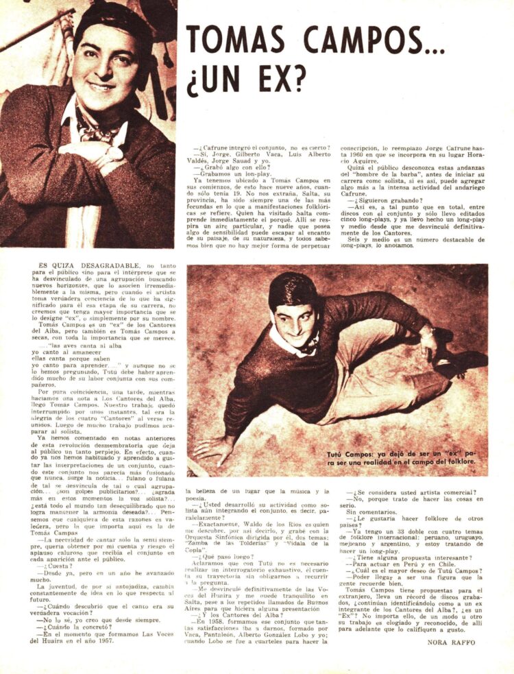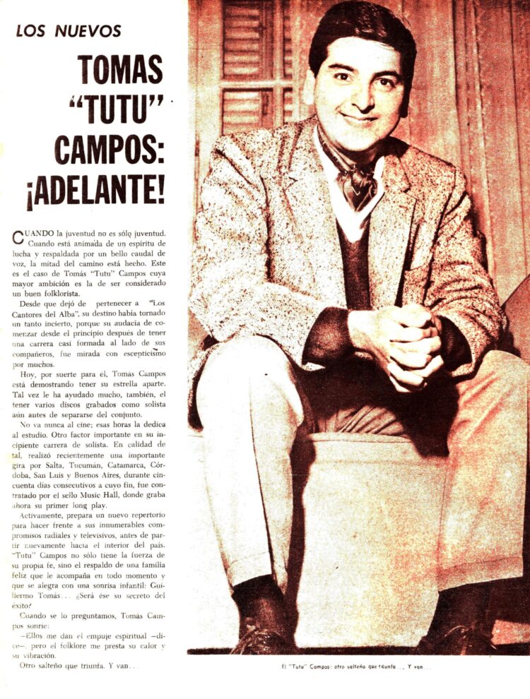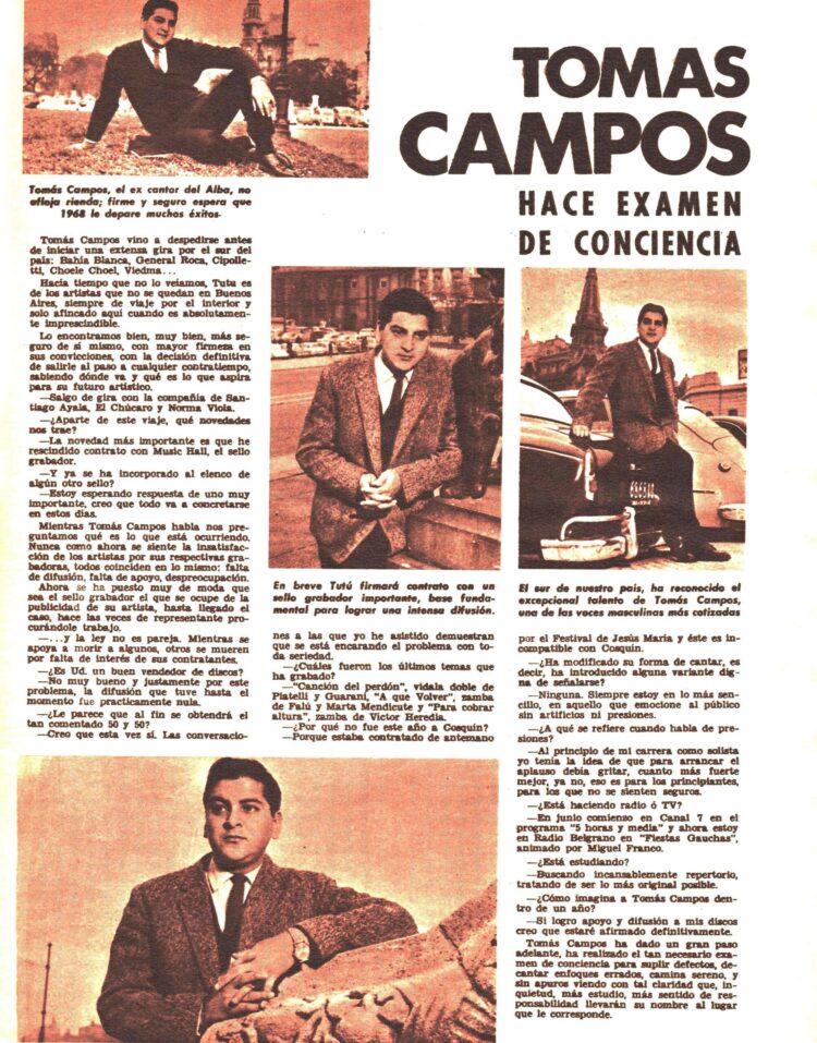 En otra entrevista aparecida en el Nº 95 ( 1/6/1965) titulada “Tomas Campos en búsqueda de nuevos horizontes” se comenta su alejamiento de la Cantores del Alba desde finales del mes de marzo y  muchos de sus proyectos en esta nueva etapa de solista.