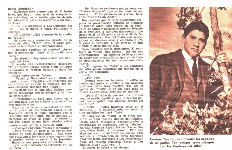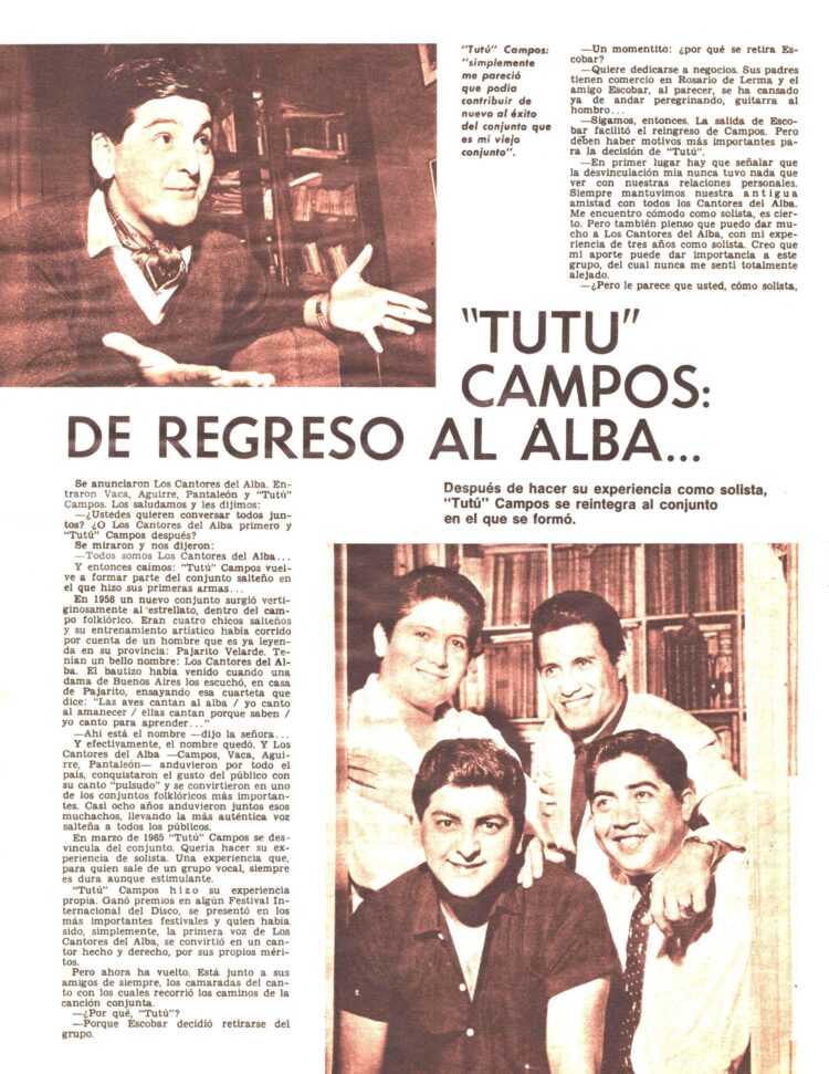 Y para finalizar esta recopilación ,en Revista Nº 164 (3/9/1968) se anunciaba el regreso del Tutú Campos al Conjunto “Los Cantores del alba” .
