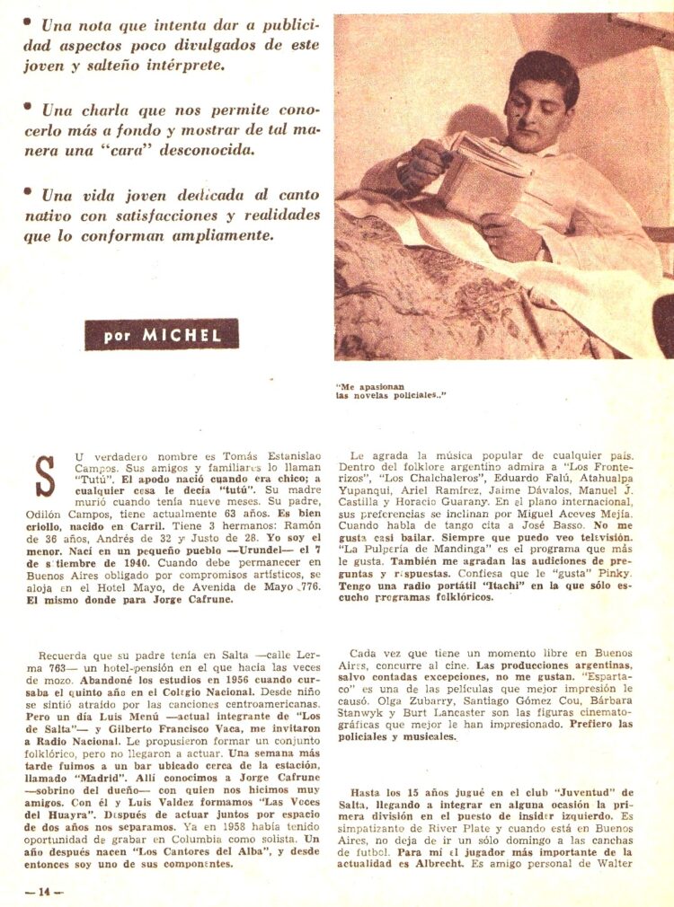 Y en Folklore Nº 41 (2/4/1863)  León Benarós para su sección “El otro yo” que firmaba con el pseudónimo de Michel,  publica un amplio reportaje de Tutu Campos donde también se comentan aspectos de su vida y la trayectoria artística.