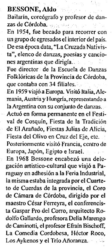 Un 30 de Mayo de 2015  fallecía el conocido bailarín, coreógrafo y  profesor de danzas Aldo Bessone , nacido en Córdoba  el 17 abril de 1926.
