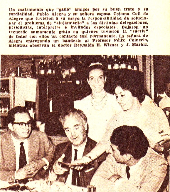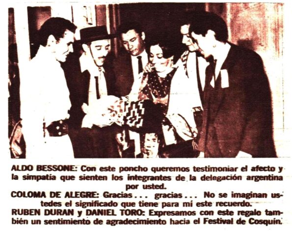 A propósito de una pequeña noticia aparecida en un Suplemento de la Revista Folklore Argentino de Mayo de 1968 dedicado enteramente al III Festival Latinoamericano de Folklore de Salta , donde se muestra a Aldo Bessone, Daniel Toro y  el pianista Rubén Duran regalándole un poncho a la Señora Coloma de Alegre , queremos desde esta Página Web recordar a esta docente y protagonista imprescindible en las actividades del Festival de Cosquín .