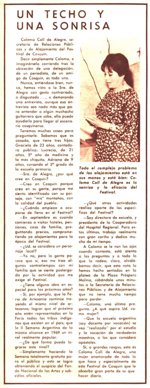 Aquí está un entrevista publicada en Revista Nº 157 (30/1/1968) a la Señora Coloma Coll de Alegre donde cuenta de todas las áreas y labores del Festival de Cosquín donde estuvo involucrada durante muchos años.