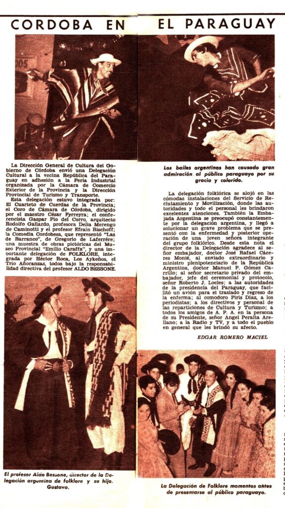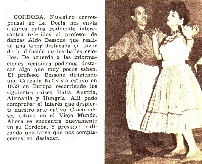 Y para finalizar esta pequeña recopilación en la Revista 161(4/6/1968) nos informan a través del corresponsal Edgar Romero Maciel ,que la Dirección de Cultura de Córdoba había enviado una nutrida delegación, donde también participaba Aldo Bessone y su grupo de Danzas, a una Feria Industrial realizada en Paraguay.
