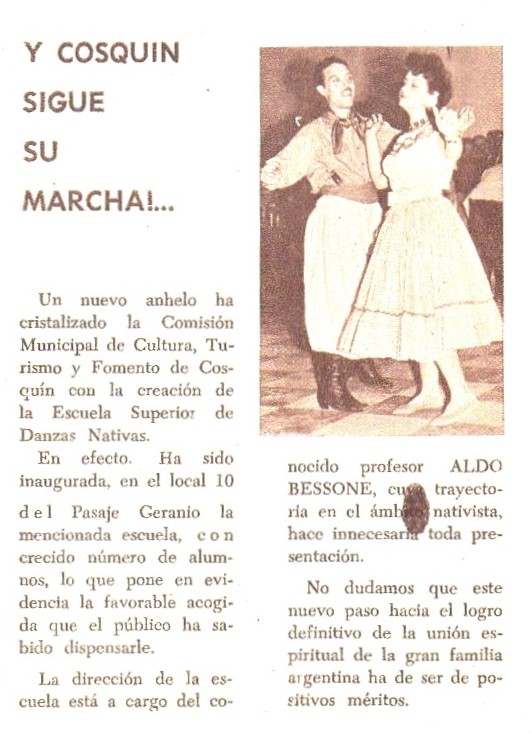 Que la Comisión Municipal de Cultura de  Cosquín había creado una Escuela Superior de Danzas Nativas a cargo de Aldo Bessone se informa en el Nº 43 (30/4/1963)