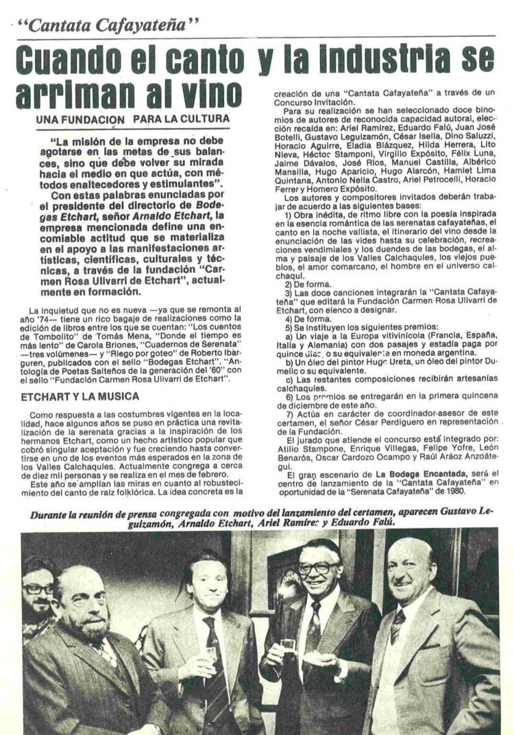 La Revista Folklore cuando se realizó la Sexta edición en 1980, publica un largo reportaje del evento con la firma de su directora Blanca Rebori. Coincidía con la Convocatoria hecha por la “Fundación Carmen Rosa Ulivarri de Etchart” , para que reconocidos autores y compositores, crearan doce temas que se editarían como “Cantata Cafayateña” . Algunos de ellos serían interpretados aquel año en el escenario “Payo Solá” de la “Bodega encantada” y luego grabados en un disco de larga duración.