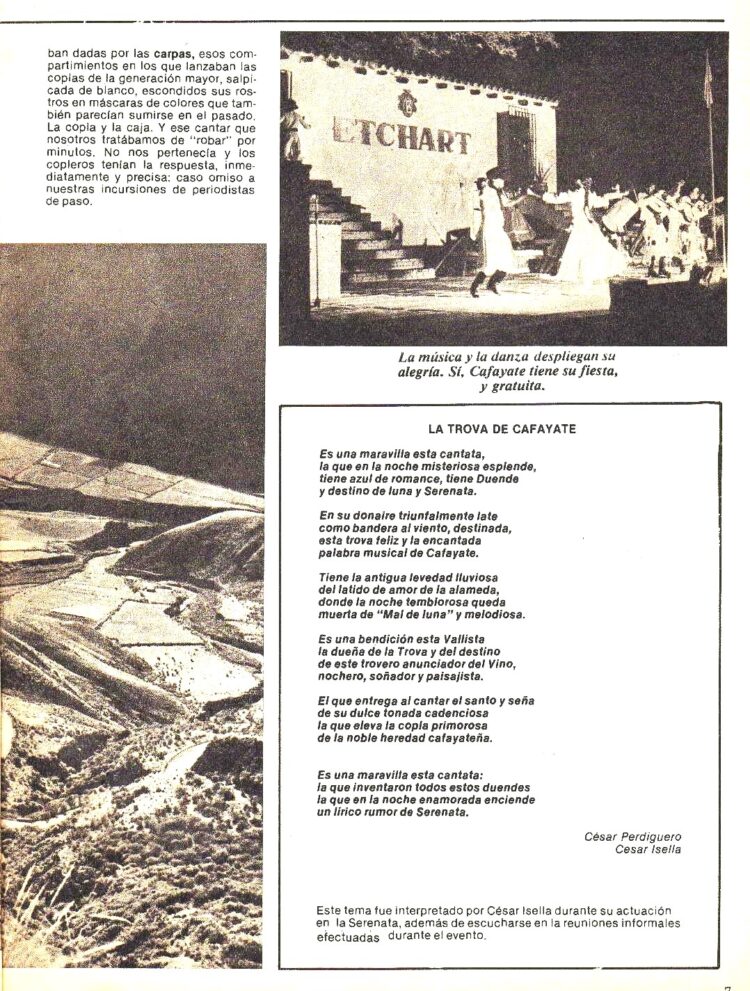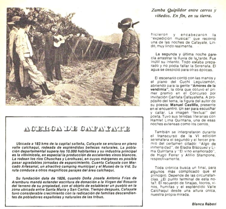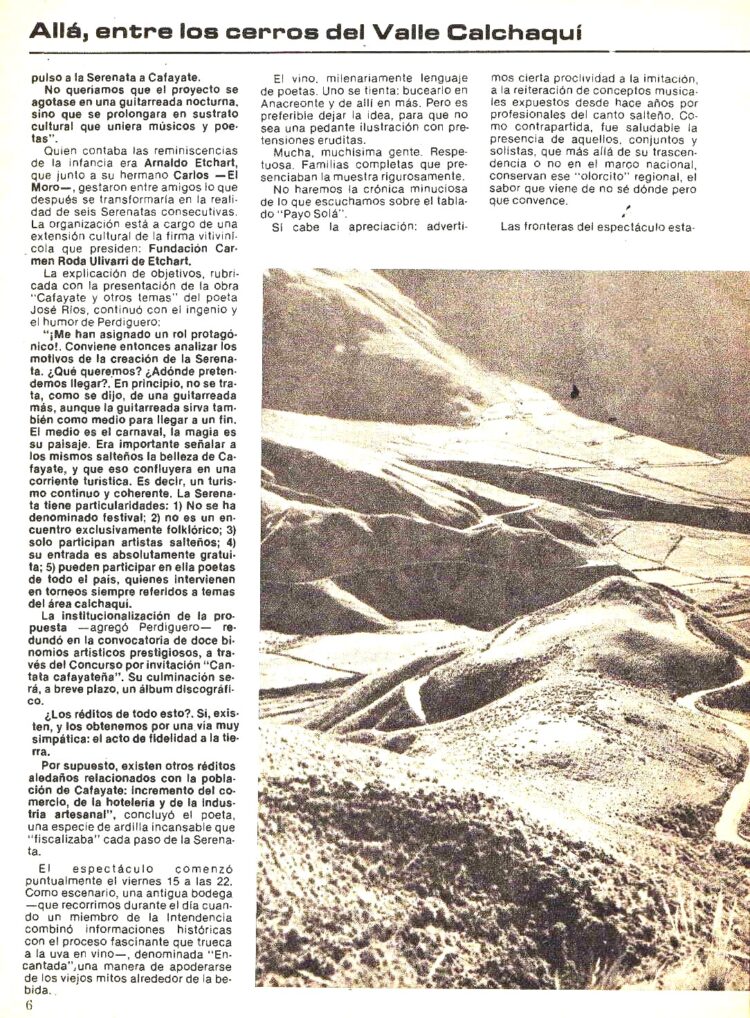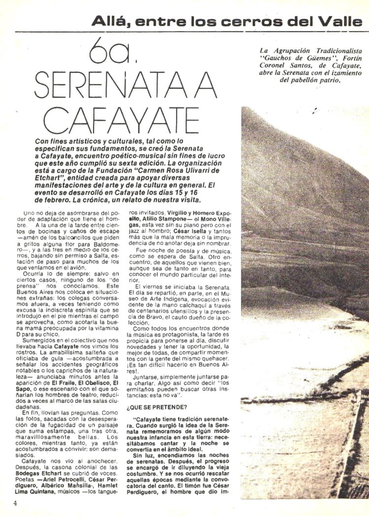 Como se decía mas arriba, las crónicas de aquella 6ª Edición de la “Serenata a Cafayate” aparecieron en el Nº 303 (Abril de 1980). Las jornadas estuvieron realzadas por la presencia entre otros, del Cuchi Leguizamón, Hamlet Lima Quintana, Manuel Castilla , Virgilio Expósito, Ariel Petrocelli , El Mono Villegas etc.