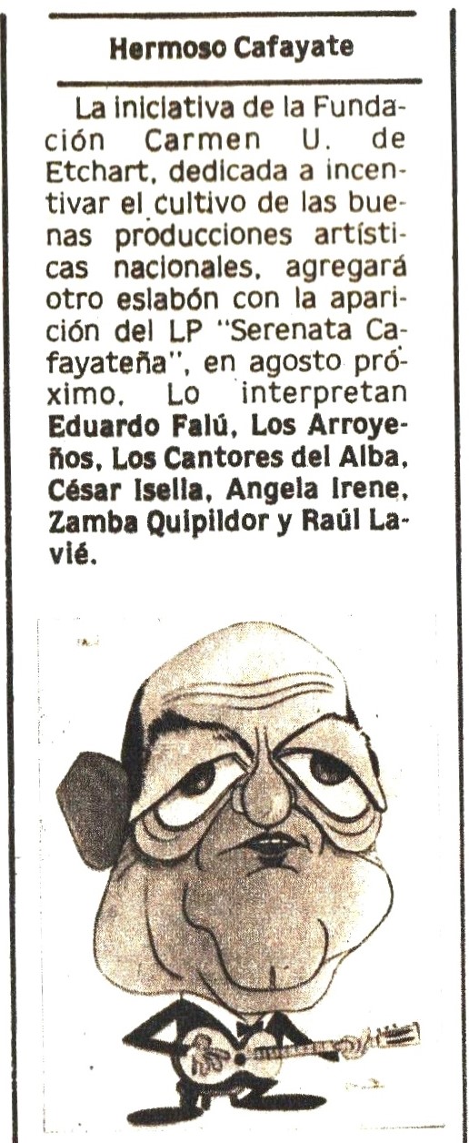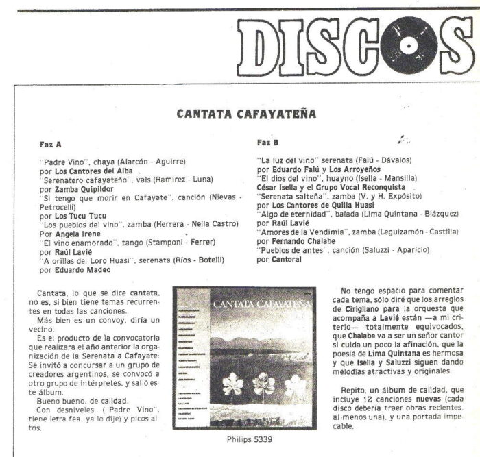 Una pequeña nota aparecida en el Nº 305 (Junio de 1980) informaba de la inminente edición de la “Cantata Cafayateña”