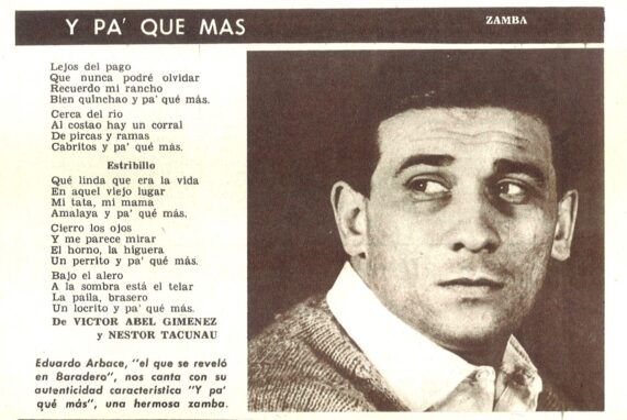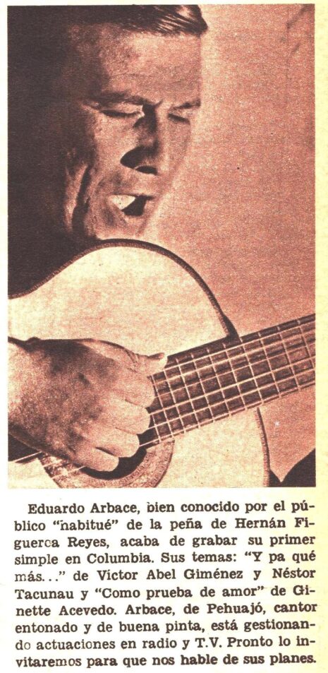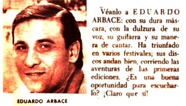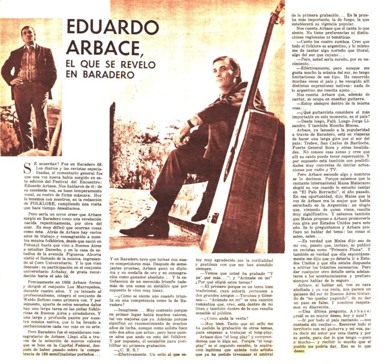 Eduardo Arbace luego de integrar el Conjunto “Los Marrupeños” comenzó su carrera como solista y encontró el éxito en el Festival de Tango y Folklore de Baradero en la edición del año 1968 donde fue revelación del certamen de nuevos valores. Así podíamos leer en Revista Nº 159 (4 de abril de 1968)