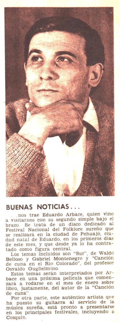 En REvista Nº 166 (11/117/1968) se comunica la aparición de una grabación que contenía los temas “Sur” de Waldo Belloso y Gabriel Montenegro y “Canción de cuna del Río Colorado” de Osvaldo Guglielmino, con motivo de la realización del “Festival Nacional del Folklore Sureño” donde iba a ser la figura central. Se deja el audio de “Sur”