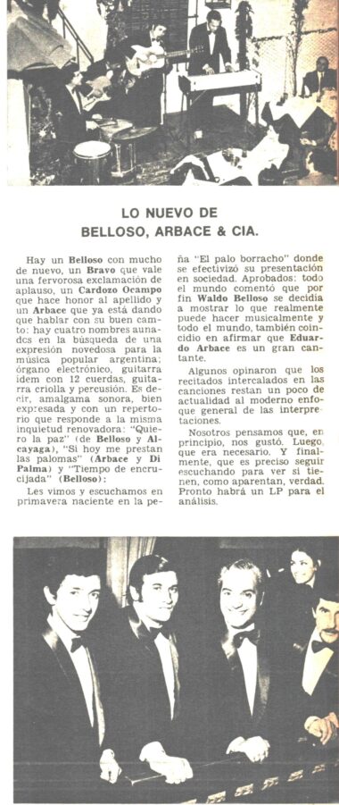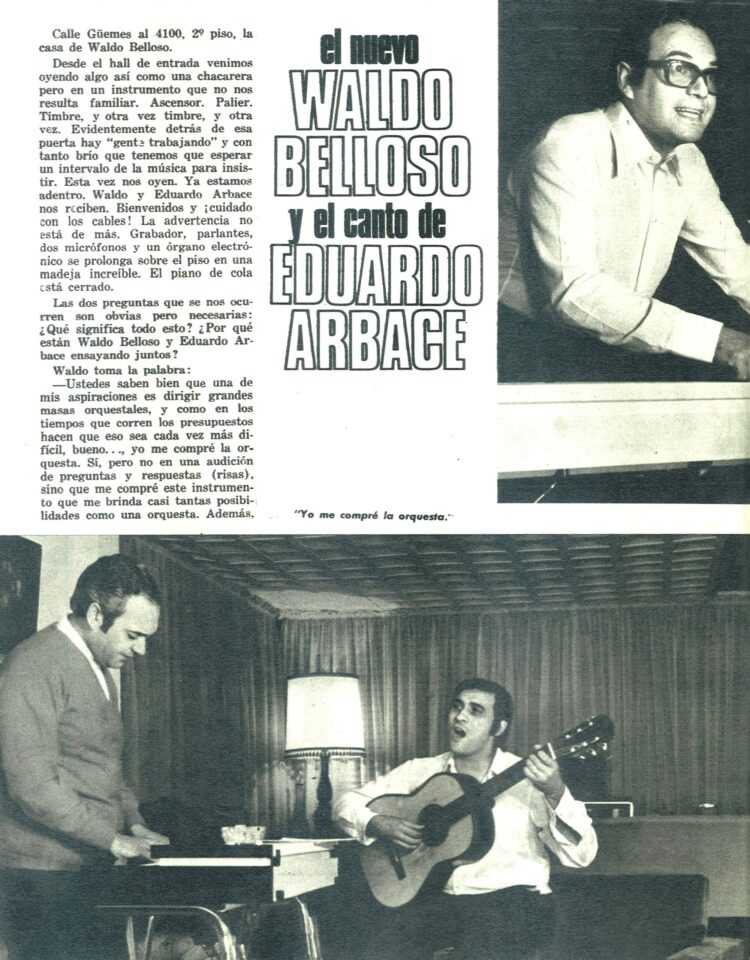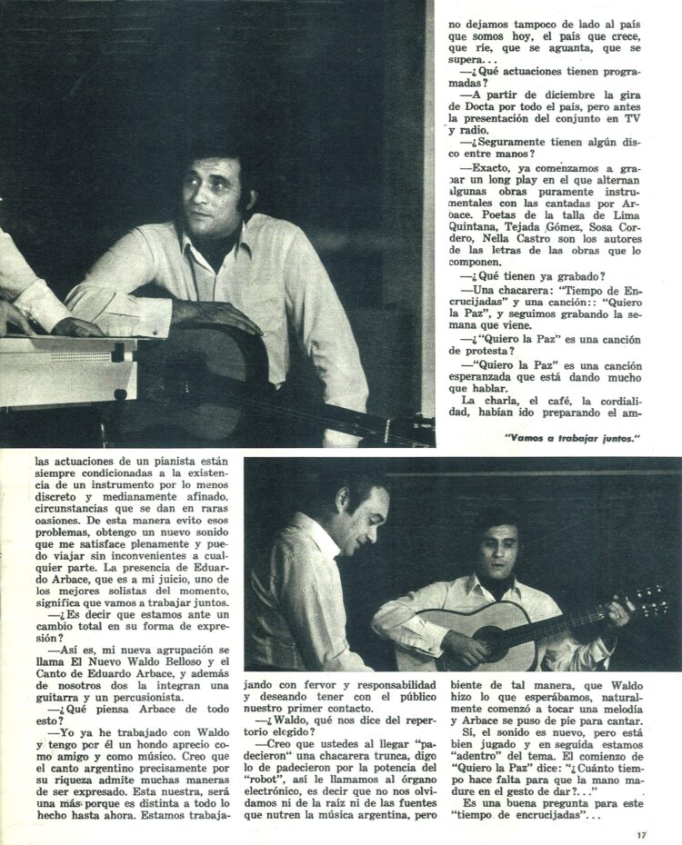 Y en Folklore Nº 186 (Junio de 1970) se publica un reportaje a Waldo Belloso y Eduardo Arbace que habían decidido actuar juntos , acompañados de otra guitarra y percusión. Además de presentar el proyecto comentan el comienzo de un LP para lo cual ya habían grabado los primeros temas.