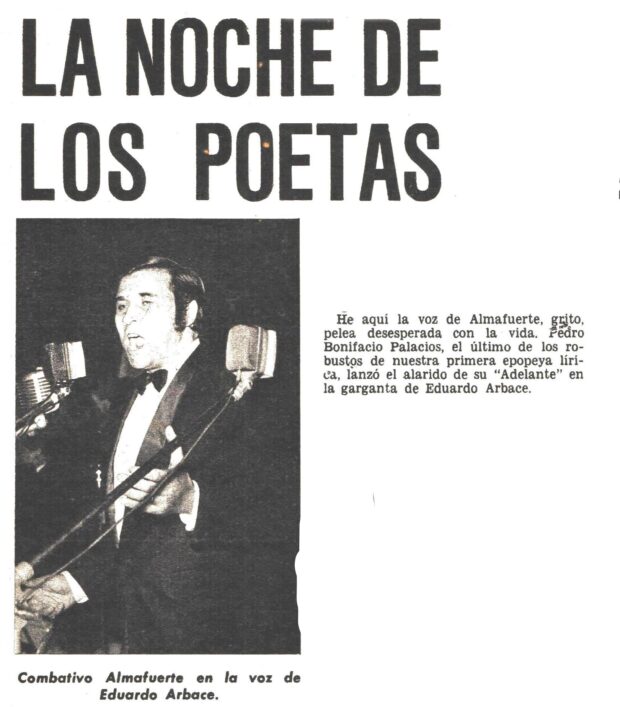 El domingo 24 de enero de 1971 , en el marco del Festival de Cosquín , en una velada llamada “La Voz de los poetas” se cantaron poemas con la presencia de figuras como Jaime Dávalos, Zupay, Jovita Luna, Daniel Toro o Hernán Figueroa Reyes . Eduardo Arbace cantó un poema de Almafuerte titulado “Adelante”. En el Nº 194 (Febrero de 1971)