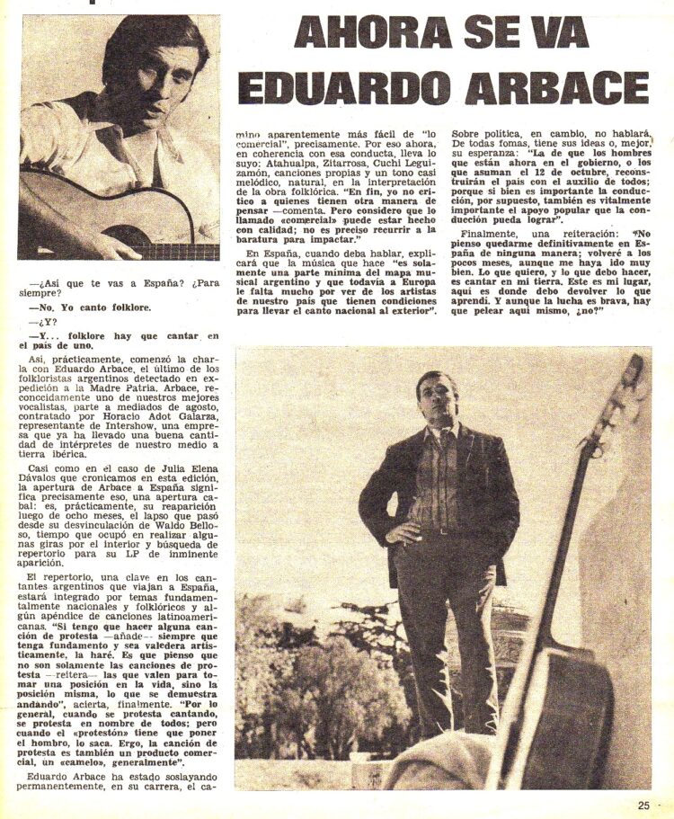 Finalmente en Folklore Nº 224 (Agosto de 1973) se anuncia que Eduardo Arbace viajaba a España contratado por Horacio Adot Galarza aunque sus expectativas eran volver en poco tiempo. Opina también sobre el canto social y la nueva situación política que se vivía en el país.