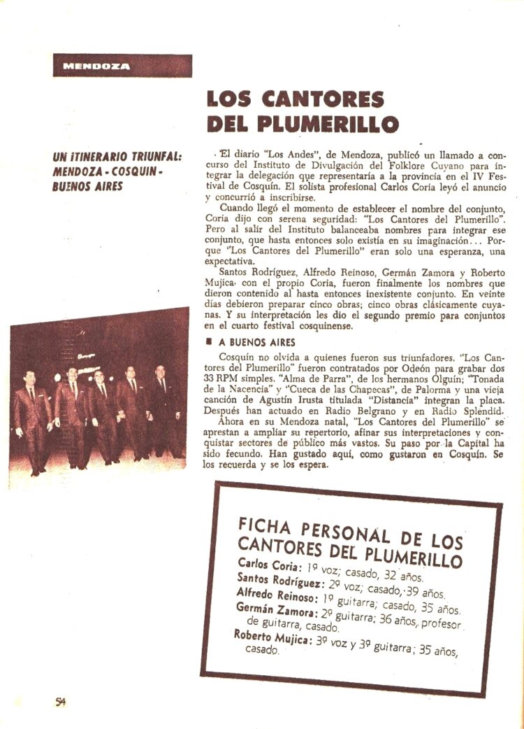 El mendocino Carlos Coria ante el llamado a Concurso para integrar la delegación provincial al IV Festival de Cosquín se inventó el nombre de “Los Cantores del Plumerillo” y en veinte días junto a cuatro compañeros, prepararon cinco temas bien cuyanos con los que finalmente obtuvieron el segundo premio.