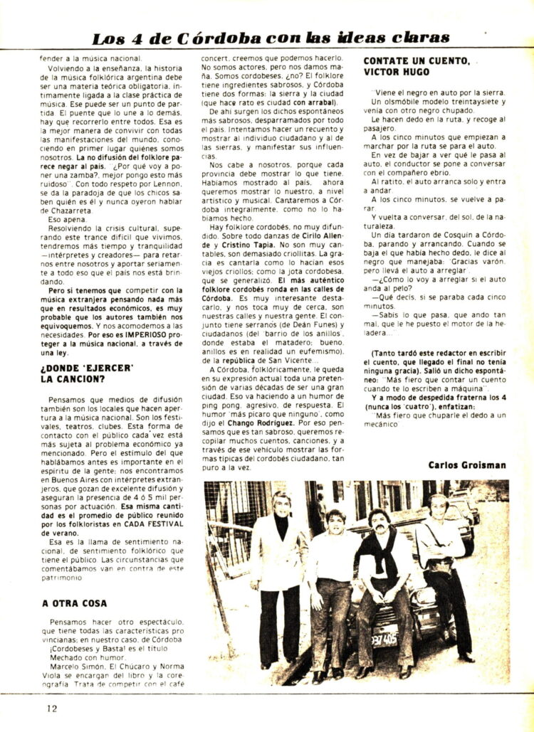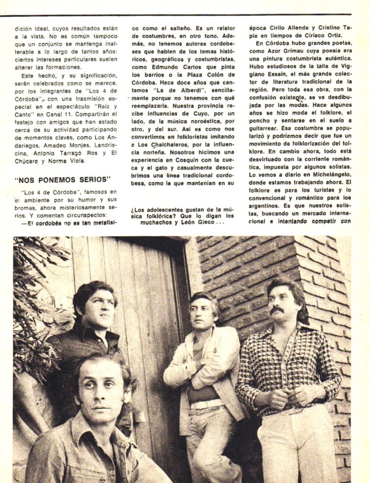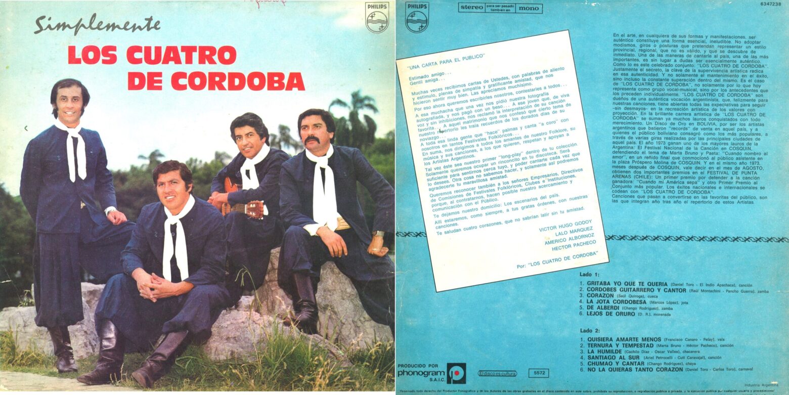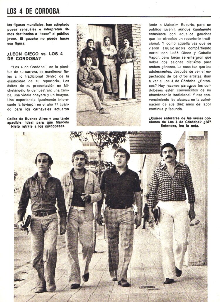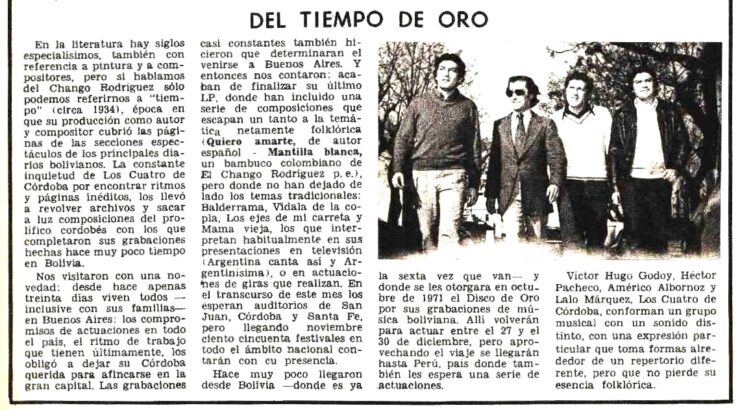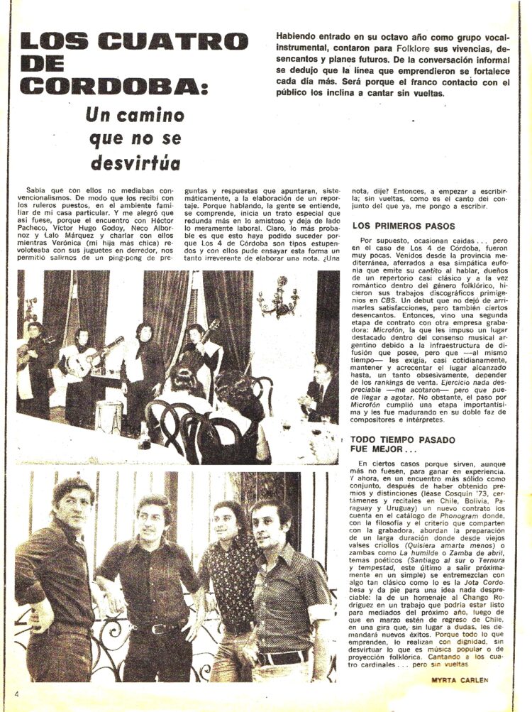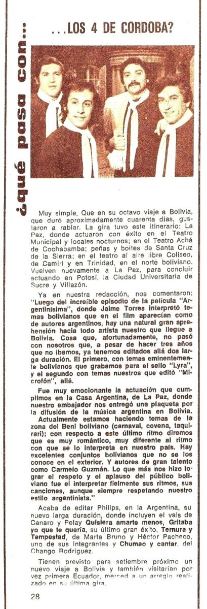 En Folklore Nº 258 (Junio de 1976) informaba del éxito de su nueva gira por Bolivia y la edición de un nuevo LP que se llamó ”Simplemente los 4 de Córdoba”