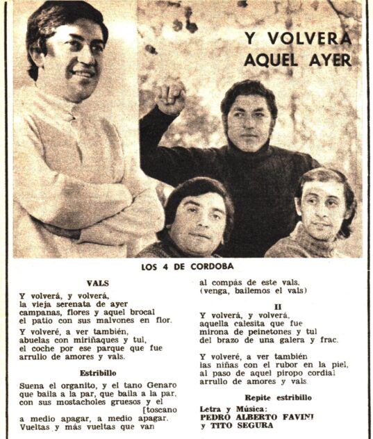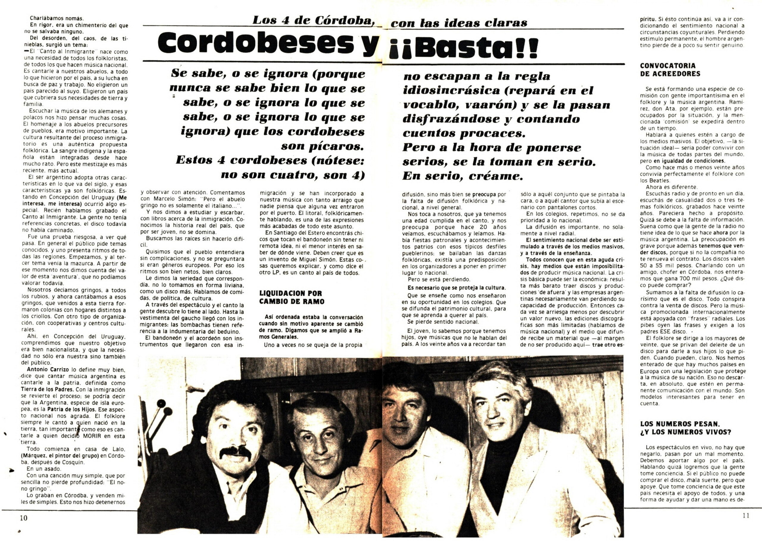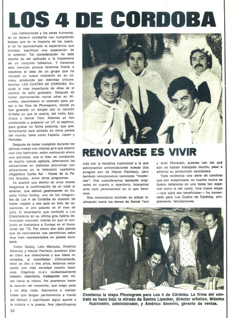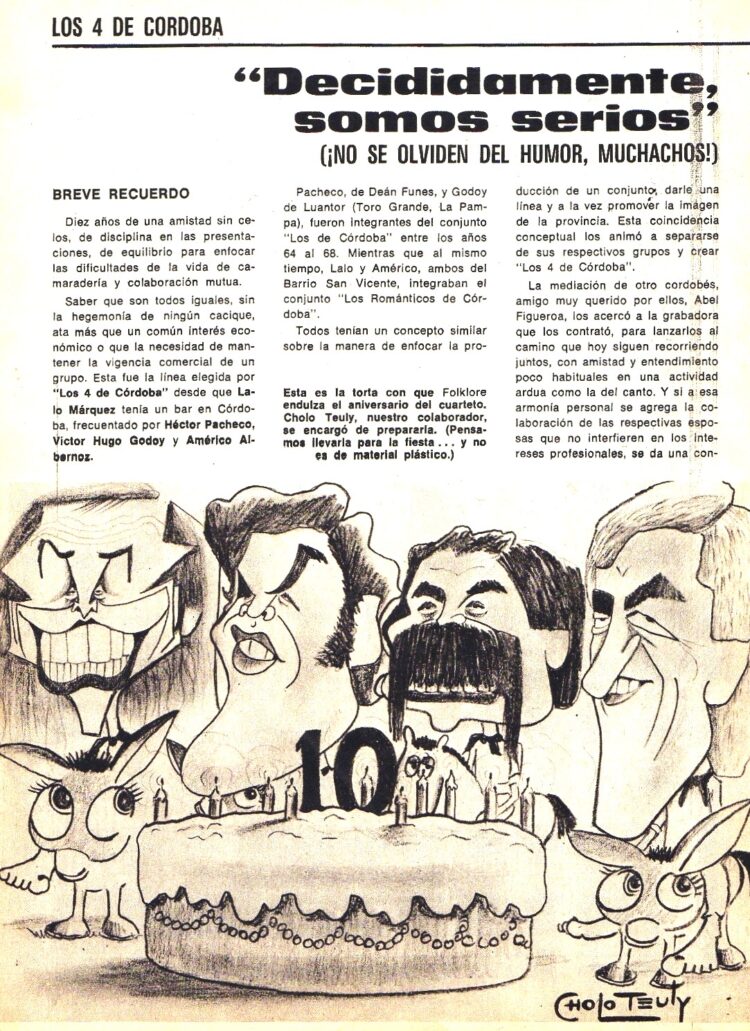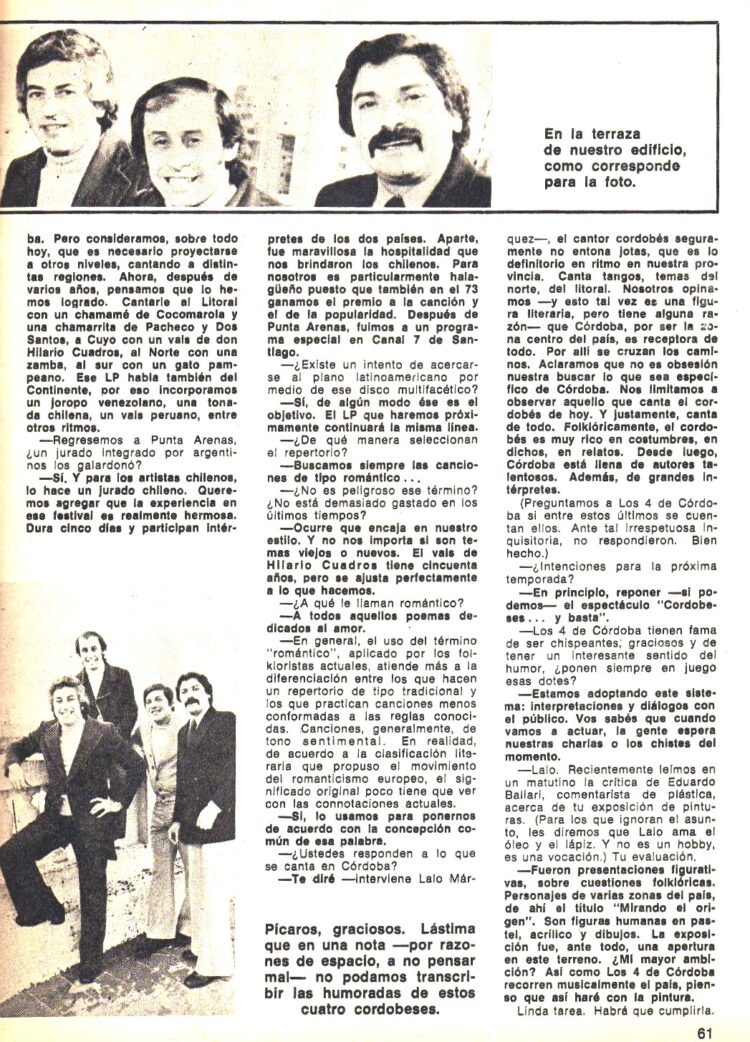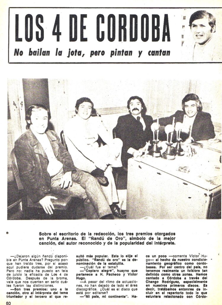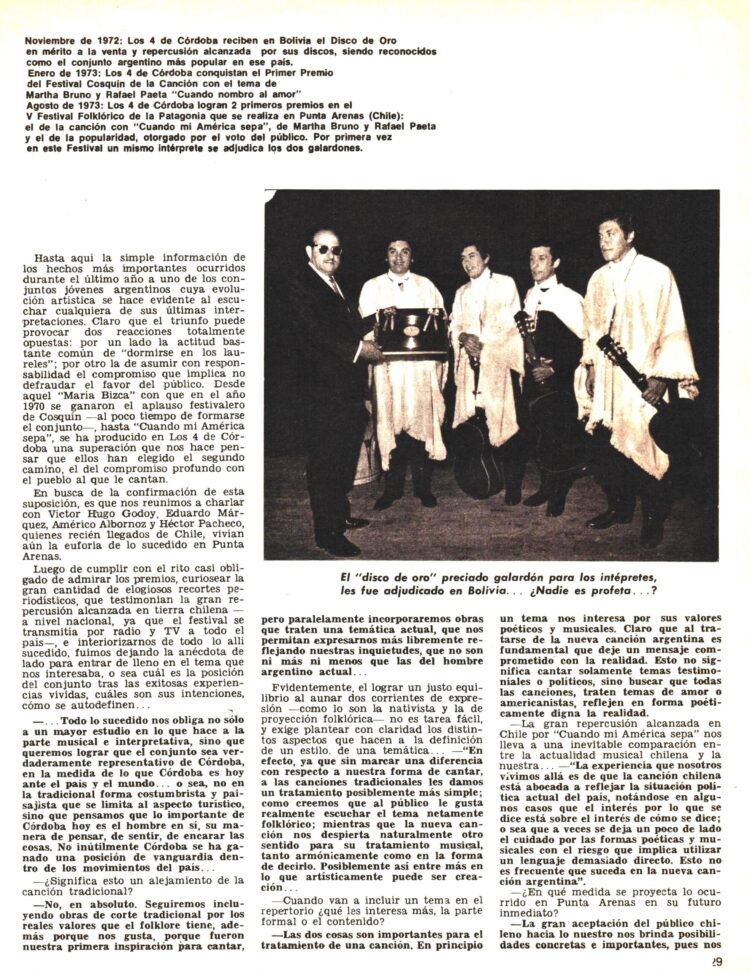 En Folklore Nº 258 (Junio de 1976) informaba del éxito de su nueva gira por Bolivia y la edición de un nuevo LP que se llamó ”Simplemente los 4 de Córdoba”