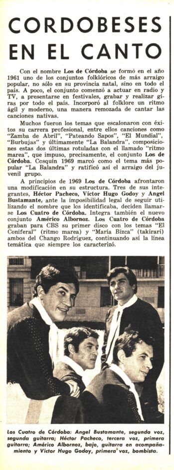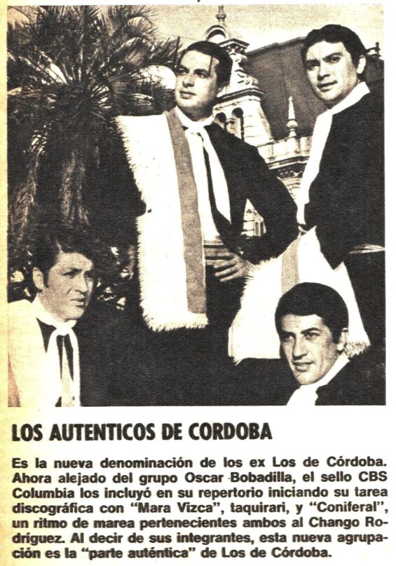 Como se decía en la nota dedicada a “Los de Córdoba”, en 1969 Héctor Pacheco, Víctor Hugo Godoy, Ángel Bustamante junto a Américo Albornoz prosiguen su trayectoria inicialmente como los “Auténticos de Córdoba” grabando para CBS dos temas del Chango Rodríguez: el taquirari “Maria Vizca” y el ritmo de marea “Coniferal”. Nota publicada en Revista Nº 173 (Mayo de 1969) .