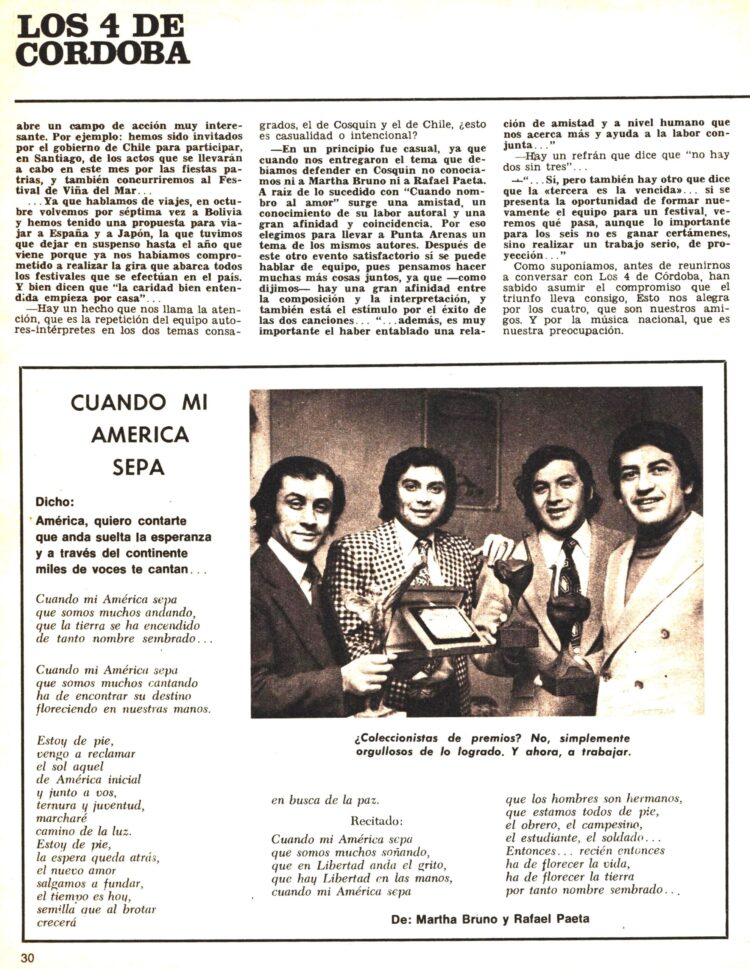 De los éxitos obtenidos por el Conjunto en el Festival de Cosquín y en el de Punta Arenas (Chile) se habla en la Revista Nº 225 (Setiembre de 1973) . En este último habían triunfado interpretando el tema “Cuando mi América sepa” también de Martha Bruno y Rafael Paeta.