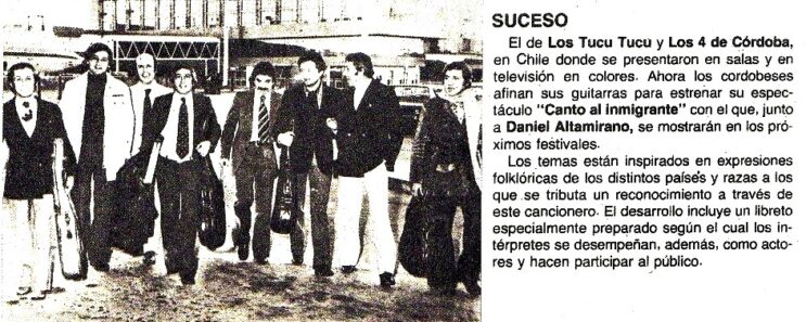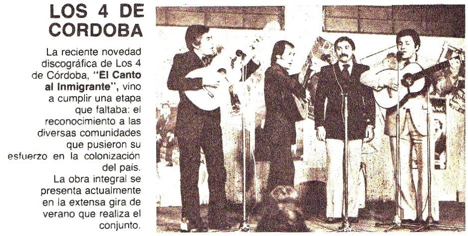 En el Nº 286 (Octubre de 1978) anuncian que “Los 4 de Córdoba” y Daniel Altamirano presentarían como espectáculo su “Canto al inmigrante”.