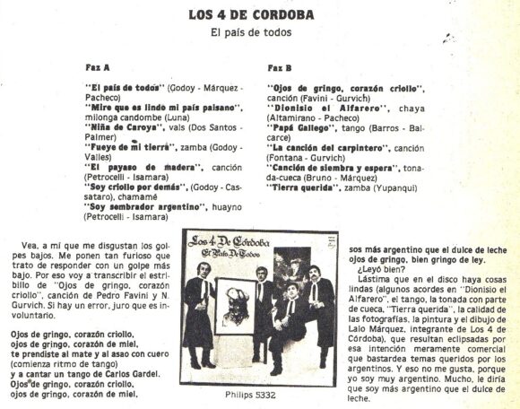 De 1980 es su disco “El país de todos” Philips 5332, del cual apareció un pequeño comentario en la Sección Discos escrita en este tiempo por Juan Carlos Blanco y publicada en el Nº 313 (Febrero de 1981). Al parecer había habido cosas de la grabación que no le habían satisfecho.