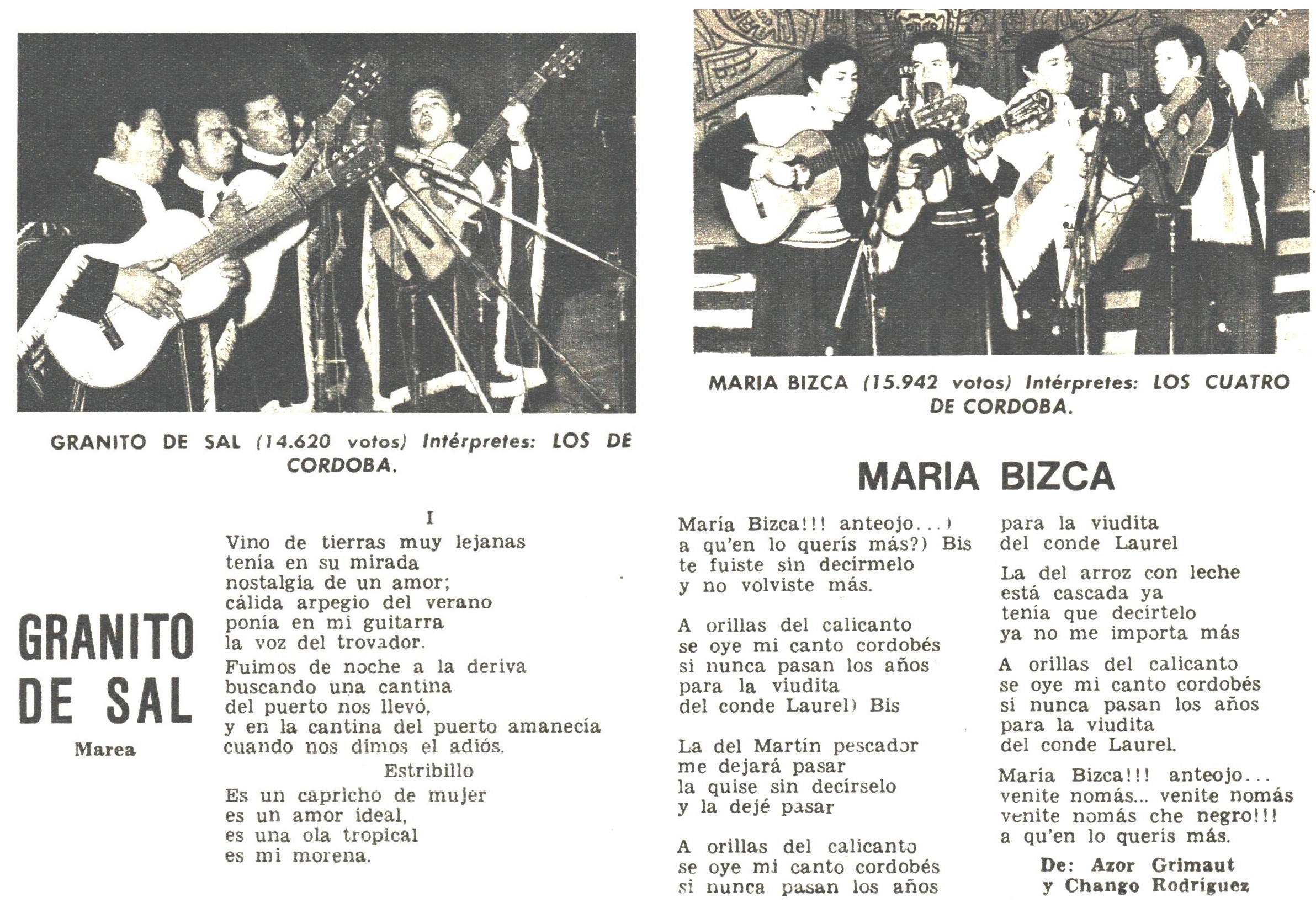En aquella edición de Cosquín 1970 el diario “Los Principios” organizó un concurso para determinar las canciones mas populares del Festival. “Los 4 de Córdoba” con “Maria Bizca” y “Los de Córdoba” con “Granito de sal” fueron los conjuntos que quedaron segundos y terceros respectivamente.