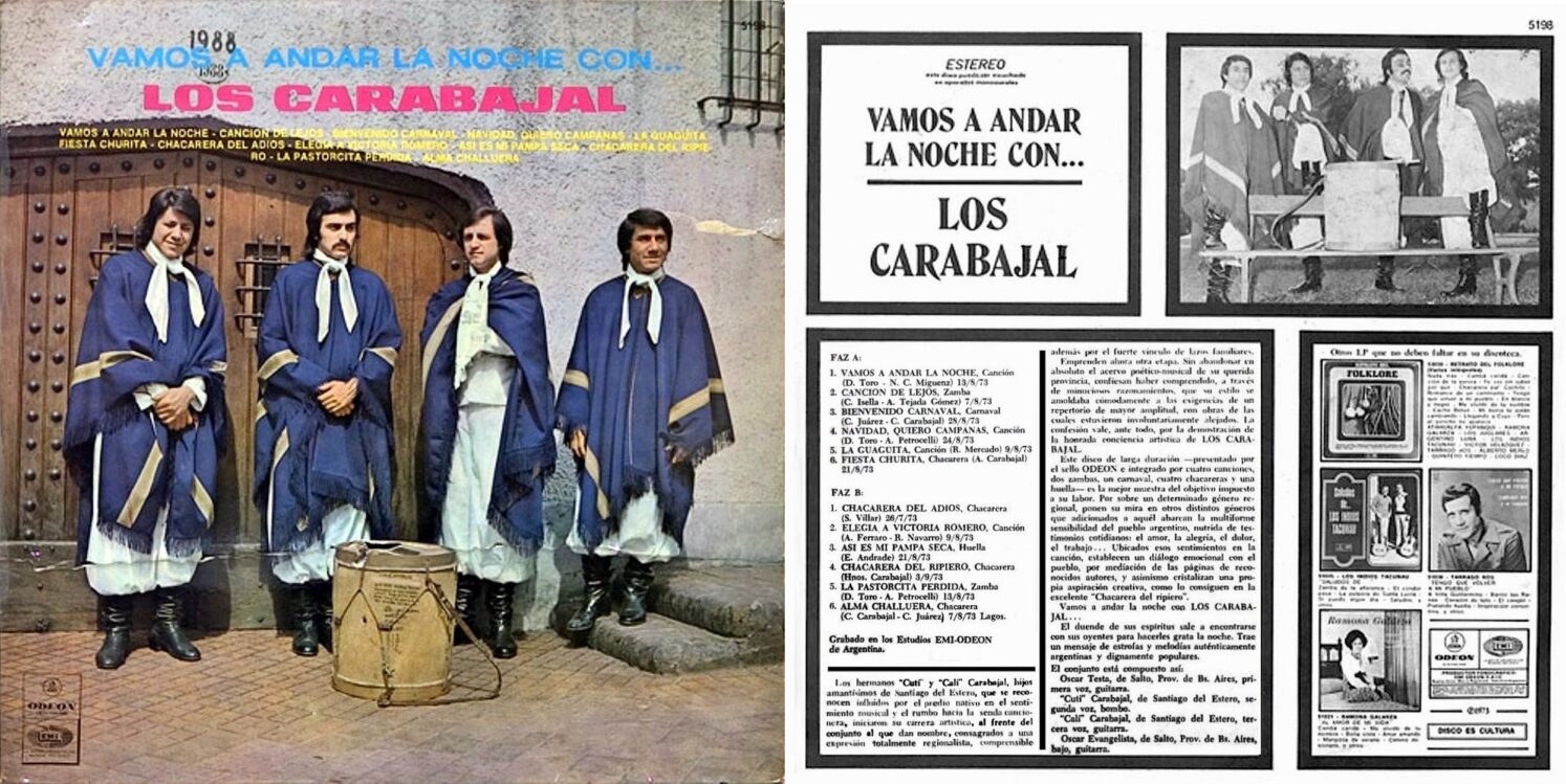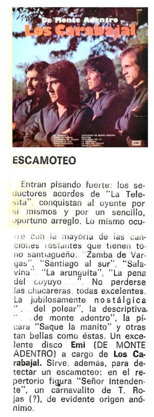 En 1976 graban el LP “De monte adentro” EMI-Odeón 6298 donde aparece el tema “La Telesita “. La letra del retumbo  “Santiago al Sur” de Petrocelli y Cuti Carabajal se publicó en el Nº 243 (Marzo de 1975)