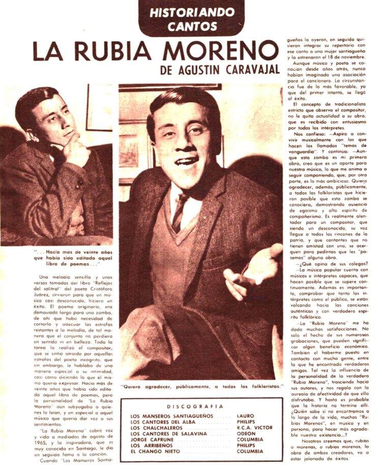 Su popular zamba “La Rubia Moreno” mereció estar entre los temas que Alma García escogió para su sección “Historiando cantos” . Publicado en Folklore Nº 122 (7/6/1966)