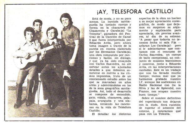 Debemos llegar al Nº 215 (Noviembre de 1972) para enterarnos que el Conjunto había sufrido otro cambio  al integrarse Oscar “Saraca” Testa  y que habían grabado La Telesita con letra de Agustín sobre música de Andrés Chazarreta. Sobre la vida de Telésfora Castillo (La Telesita) querían llevar al teatro un espectáculo musical.