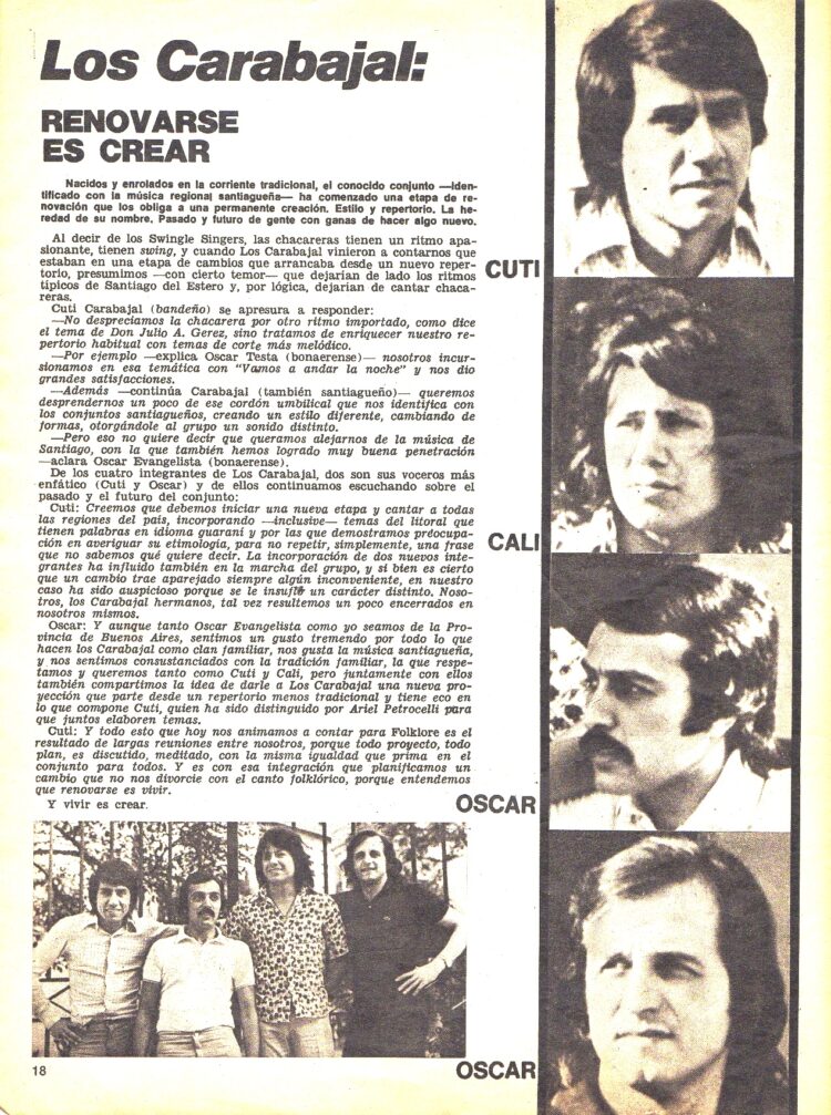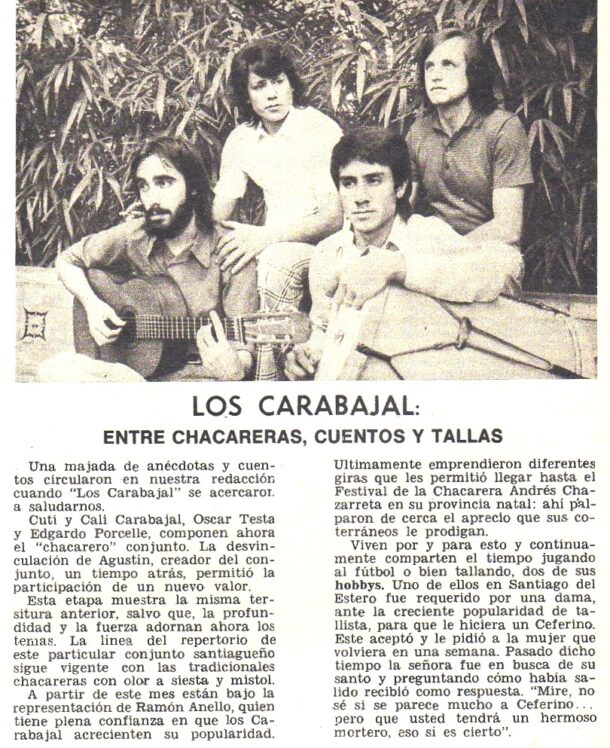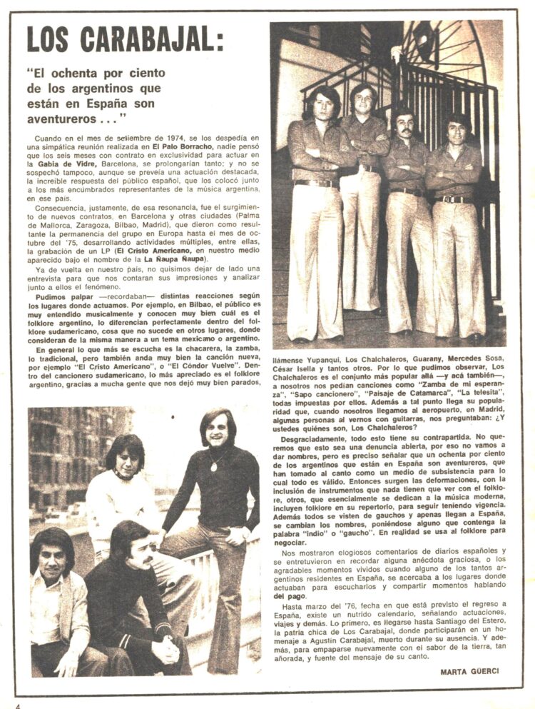 Marta Guerci los entrevista a su regreso al país en el Nº 251 (Noviembre de 1975) donde hablan de su estancia en España y Francia, no dejan muy bien parados a otros artistas argentinos que andaban cantando folklore en aquel país y anunciaban ir a Santiago del Estero para rendir homenaje a Agustín Carabajal fallecido en su ausencia.