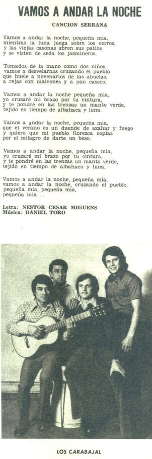 Aunque pronto entra al Conjunto Oscar “Cala” Evangelista y graban el LP Emi-Odeón 5198 “Vamos andar la noche”. La letra del tema que da nombre al disco se publicó en el Nº 227 (Noviembre de 1973), aunque la acompañaron con una foto donde aún estaba Agustín Carabajal.