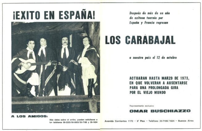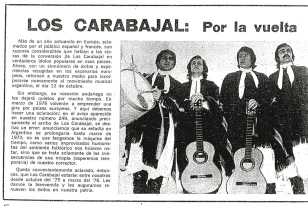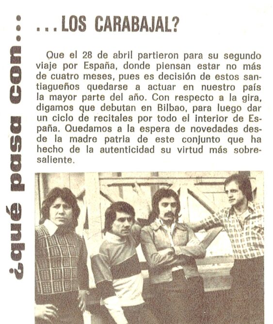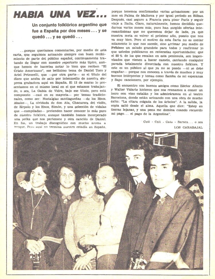 Coincidía esta aparición en el mercado español con una larga gira que estaban haciendo “Los Carabajal” por Europa. Esta carta contando sus vivencias en aquellas tierras se publicó en el Nº 246 (Junio de 1975).
