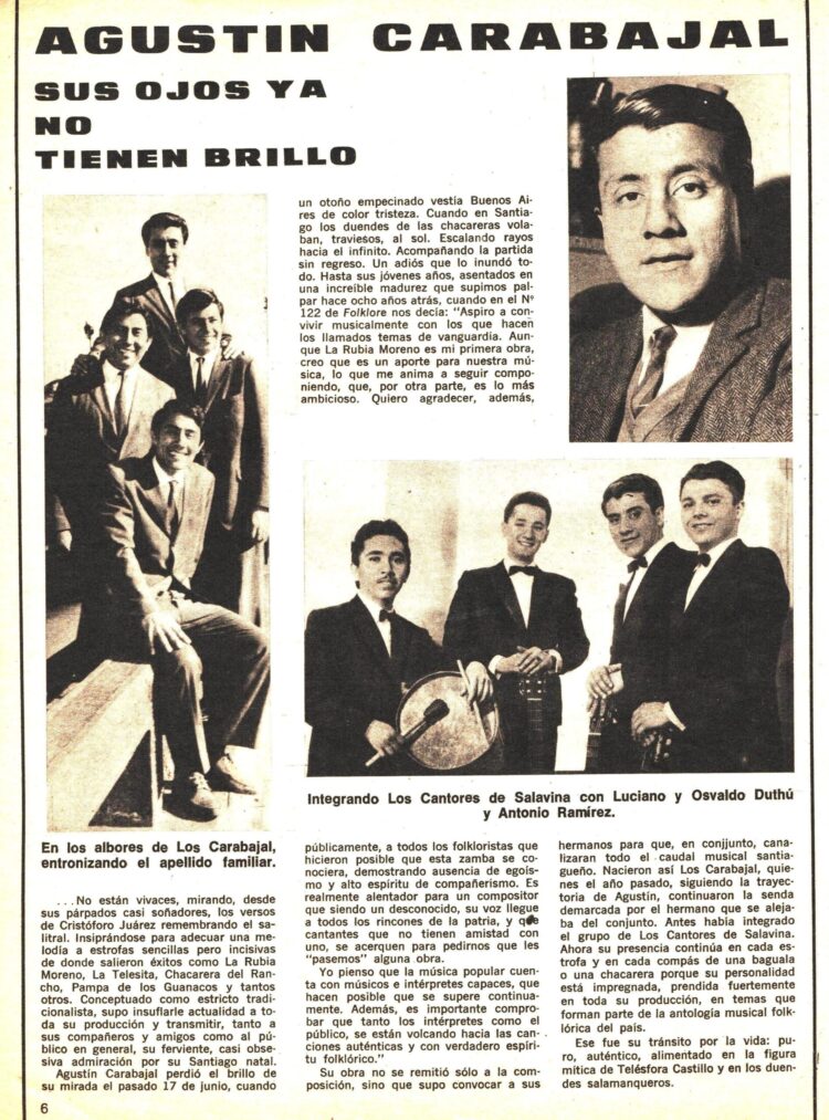 Agustín Carabajal fallece prematuramente el 14 de junio de 1975  a los 41 años de edad. La Revista Folklore publica esta nota necrológica en el Nº 247 (Julio de 1975)