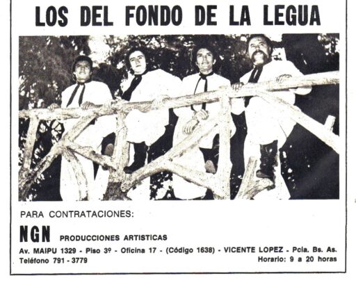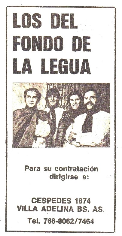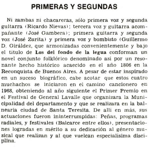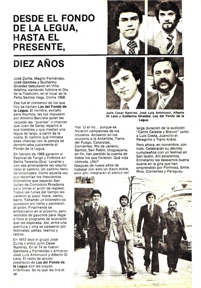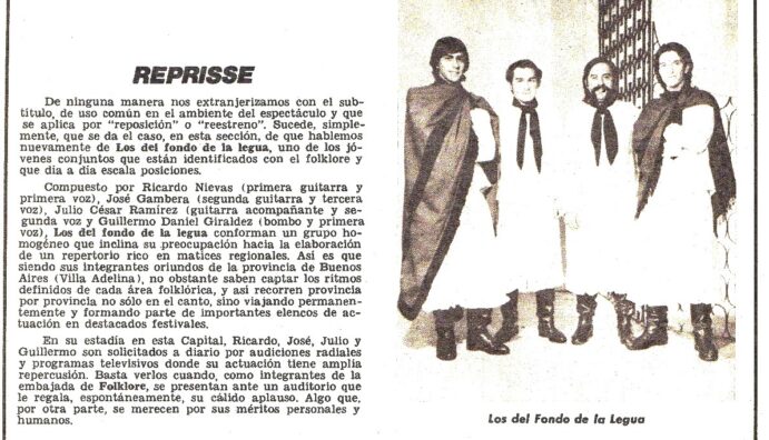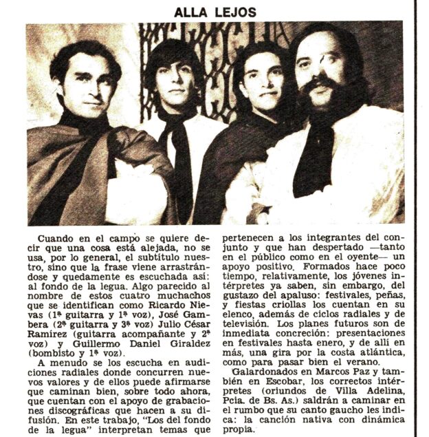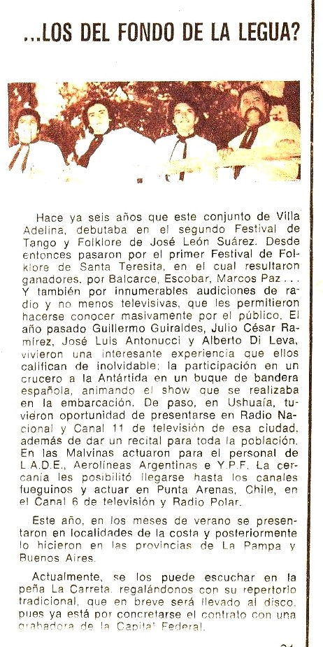 Una breve reseña de la trayectoria artística y los proyectos de” “Los del Fondo de la legua” cuyos integrantes eran en este momento Guillermo Giráldez, Julio César Ramírez, y con las incorporaciones de José Luis Antonucci y Alberto Di Leva en 1974. En el Nº 258 (Junio de 1976).