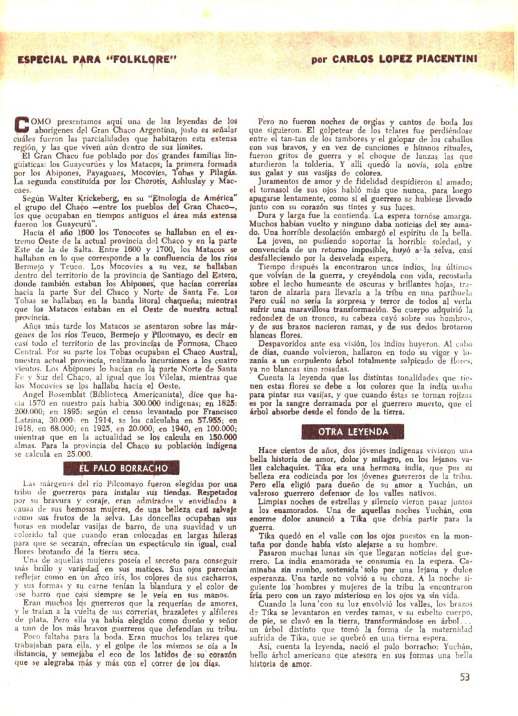 La Sección “Recorriendo el país” pasó a llamarse desde el Nº 99 (29/7/1965) sencillamente “Interior”. En ese número Carlos López Piacentini escribe sobre el Palo borracho y sus leyendas.