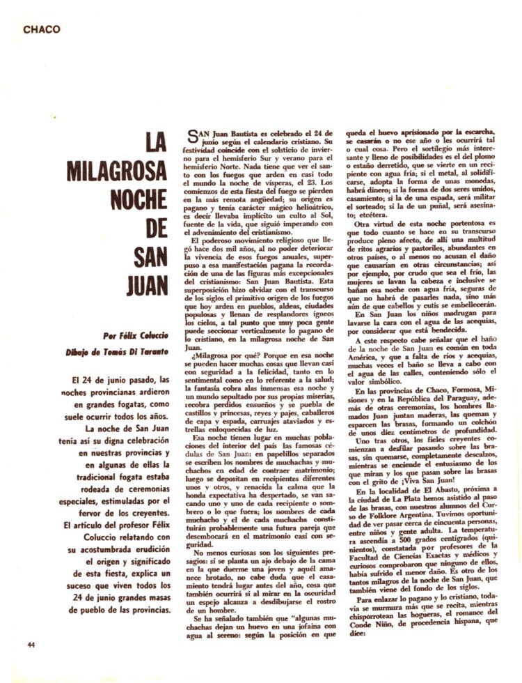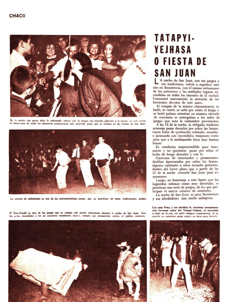 Félix Coluccio comenta los  festejos en el Chaco de la  Milagrosa Noche de San Juan., la llamada “Tatpyi-Yejhasa”.  Ilustró la nota Tomás Di Taranto a quien le dedicamos la nota del día 3 de diciembre de 2017. https://revistafolklore.com.ar/ilustradores-tomas-di-taranto/