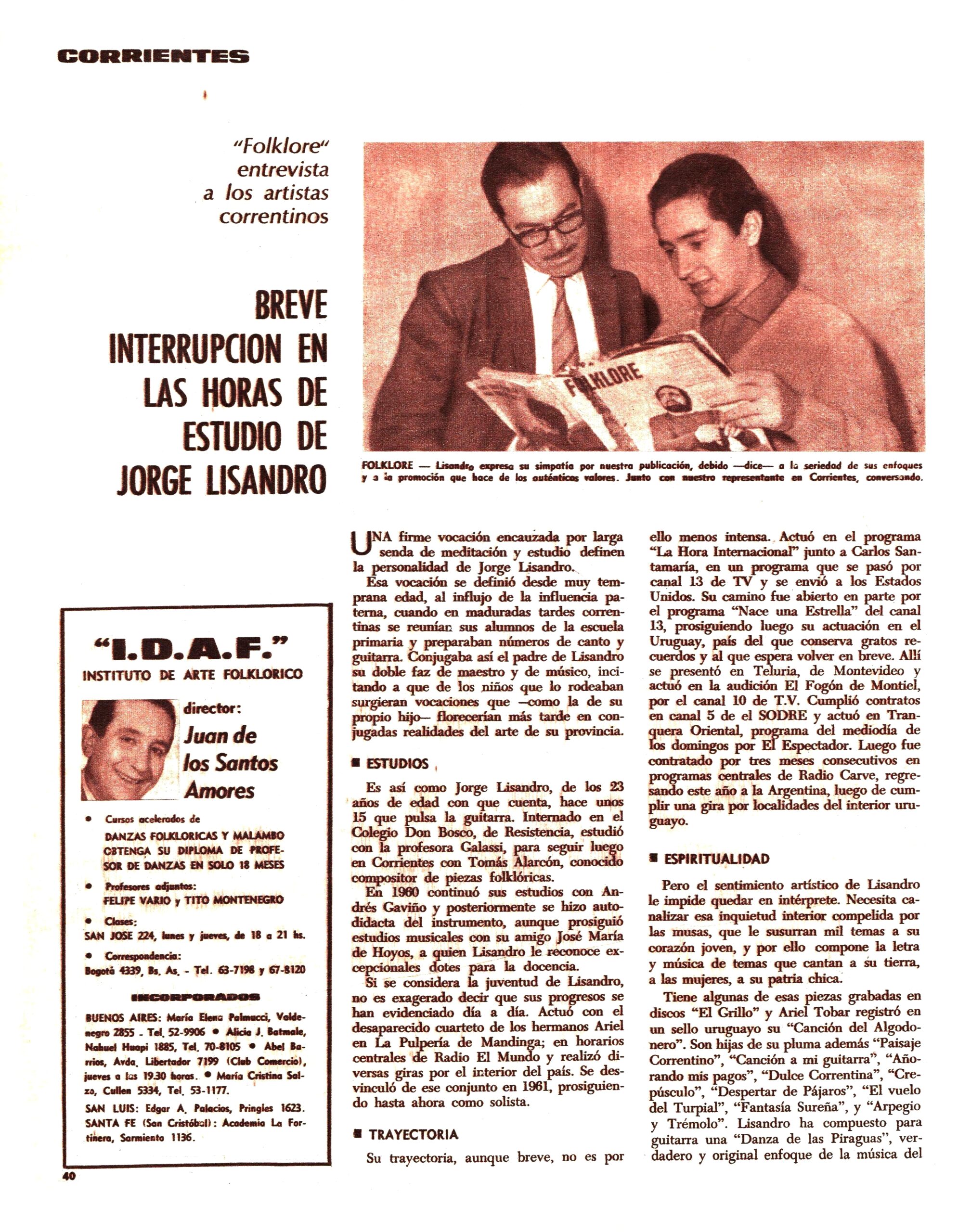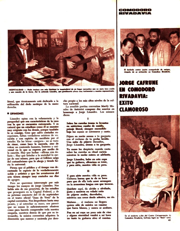 Desde Corrientes se comentaban las actividades de Jorge Lisandro , guitarrista , compositor y cantor que había pertenecido al Conjunto de Los Hermanos Ariel.