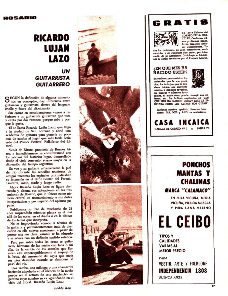 El corresponsal de la Revista en Rosario; Ruddy Koy comentaba la presencia en la localidad santafesina de San Lorenzo del artista de Zárate (Pcia Bs. As) ,Ricardo Luján Lazo, quien tenía una academia de guitarra en aquella ciudad y actuaba en diversos medios rosarinos.