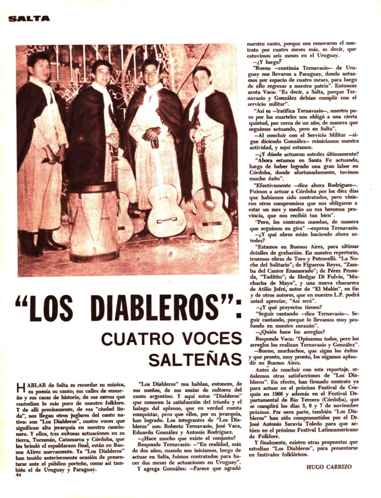 En Folklore Nº 103 (21/9/1965) se habla de “Los Diableros” que era un Conjunto originario de Salta.