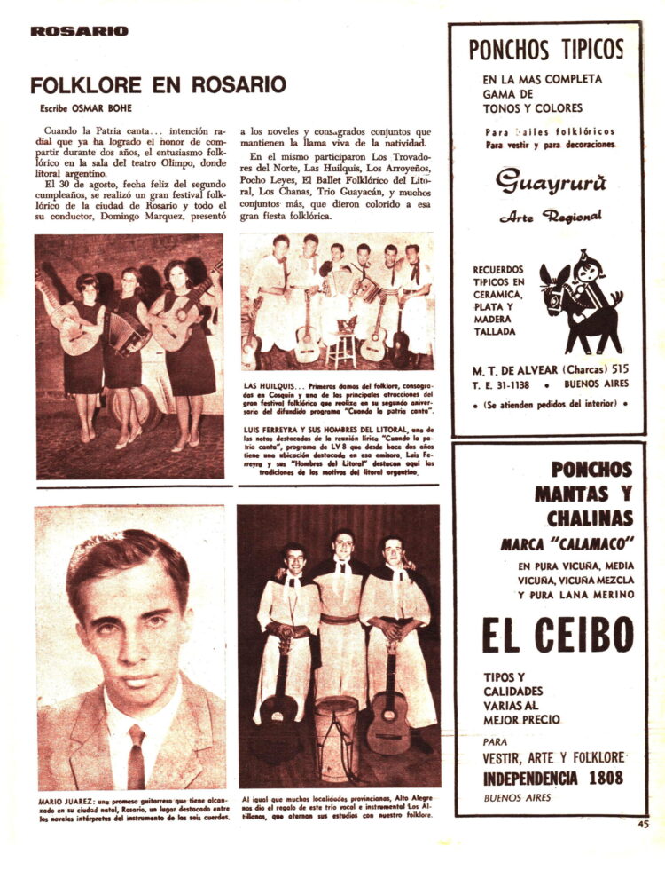 Desde Rosario llegaban noticias : El programa radial “Cuando la Patria canta” había organizado una reunión folklórica con la participación de artista como “Las Huilquis”, “Los Arroyeños” , Pocho Leyes o Luis Ferreyra y sus hombres de Litoral.