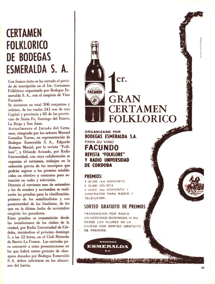 En Córdoba la Bodega Esmeralda S.A organizaba un certamen para descubrir nuevos valores folklóricos.