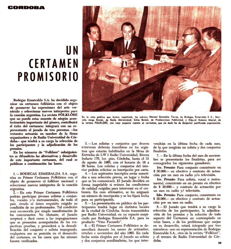 En Córdoba la Bodega Esmeralda S.A organizaba un certamen para descubrir nuevos valores folklóricos.