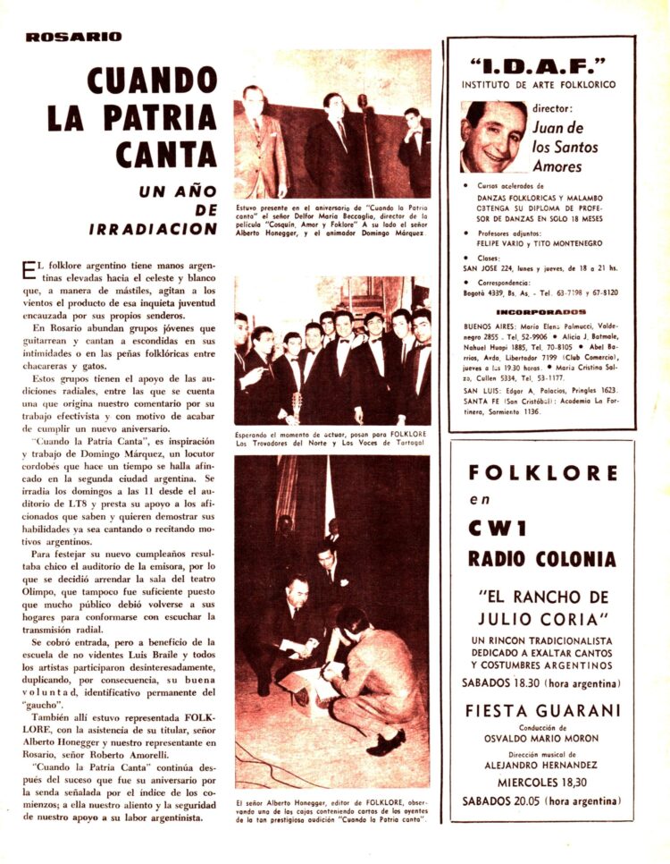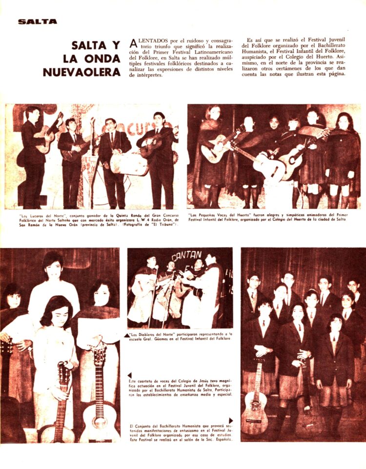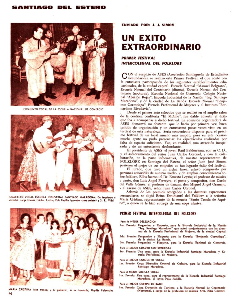El corresponsal de Folklore en Santiago del Estero, José Simón, informaba del “Primer Festival Intercolegial de Folklore”.